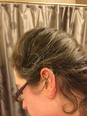 I have been itching to try the Touch Back Plus Shampoos and Conditioners I bought at ULTA. Two things, before I start my review, ULTA was doing some serious markup on these. Their website sells the shampoo and conditioner for $12.50 a bottle, though they do charge shipping (but it's a $3.95 flat rate), so if I like the stuff, I'll definitely be ordering direct! And second, not only do these not contain ammonia or peroxide, they are free of sulfates. They also have a few other products that I'm curious about, like the gray root marker. Anyway, I decided to do the color tonight. As you can see from above, I bought several different colors, as my natural color has dark brown and reddish highlights and quite frankly, I couldn't find another Dark Auburn (Dark Brown, Dark Auburn and Light Auburn). So, I'm going to force myself to breath and show you my before pictures first. My husband swears that the photos make it look worse than it really is (was? I'm still waiting for my hair to dry before doing the "afters") but I think it looks pretty darn accurate, unless I'm in a dark room, and to be 31 with so many obvious grays doesn't really make me feel great. Procrastinating again... here are the "befores".